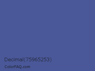 Decimal 75965253 Color is a normal blue color and the nearest color is Liberty #545aa7. Hex code #4a5899 and RGB value is rgb(74,88,153). In RGB color space, this color is composed of 29% red, 35% green, 60% blue, In CMYK color space, this color is composed of 52% cyan, 42% magenta, 0% yellow , 40% black , In HSL color space, this color has a hue angle of 229° , 35% saturation and 45% lightness.