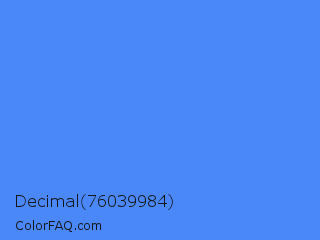 Decimal 76039984 Color is a light blue color and the nearest color is Blueberry #4f86f7. Hex code #4a88fa and RGB value is rgb(74,136,250). In RGB color space, this color is composed of 29% red, 53% green, 98% blue, In CMYK color space, this color is composed of 70% cyan, 46% magenta, 0% yellow , 2% black , In HSL color space, this color has a hue angle of 219° , 95% saturation and 64% lightness.