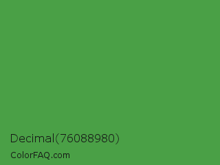 Decimal 76088980 Color is a normal green color and the nearest color is Apple #4fa83d. Hex code #4aa046 and RGB value is rgb(74,160,70). In RGB color space, this color is composed of 29% red, 63% green, 27% blue, In CMYK color space, this color is composed of 54% cyan, 0% magenta, 56% yellow , 37% black , In HSL color space, this color has a hue angle of 117° , 39% saturation and 45% lightness.