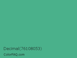 Decimal 76108053 Color is a normal green color and the nearest color is Mint #3eb489. Hex code #4ab18b and RGB value is rgb(74,177,139). In RGB color space, this color is composed of 29% red, 69% green, 55% blue, In CMYK color space, this color is composed of 58% cyan, 0% magenta, 21% yellow , 31% black , In HSL color space, this color has a hue angle of 158° , 41% saturation and 49% lightness.
