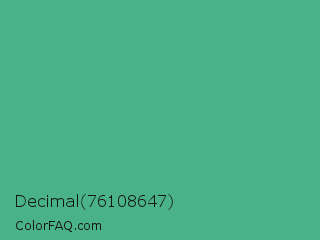 Decimal 76108647 Color is a normal green color and the nearest color is Mint #3eb489. Hex code #4ab287 and RGB value is rgb(74,178,135). In RGB color space, this color is composed of 29% red, 70% green, 53% blue, In CMYK color space, this color is composed of 58% cyan, 0% magenta, 24% yellow , 30% black , In HSL color space, this color has a hue angle of 155° , 41% saturation and 49% lightness.