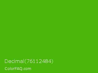Decimal 76112484 Color is a normal green color and the nearest color is Kelly Green #4cbb17. Hex code #4ab608 and RGB value is rgb(74,182,8). In RGB color space, this color is composed of 29% red, 71% green, 3% blue, In CMYK color space, this color is composed of 59% cyan, 0% magenta, 96% yellow , 29% black , In HSL color space, this color has a hue angle of 97° , 92% saturation and 37% lightness.