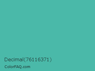 Decimal 76116371 Color is a normal cyan color and the nearest color is Verdigris #43b3ae. Hex code #4ab9a9 and RGB value is rgb(74,185,169). In RGB color space, this color is composed of 29% red, 73% green, 66% blue, In CMYK color space, this color is composed of 60% cyan, 0% magenta, 9% yellow , 27% black , In HSL color space, this color has a hue angle of 171° , 44% saturation and 51% lightness.
