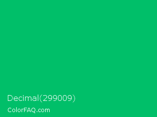 Decimal 299009 Color is a normal green color and the nearest color is GO Green #00ab66. Hex code #00bf69 and RGB value is rgb(0,191,105). In RGB color space, this color is composed of 0% red, 75% green, 41% blue, In CMYK color space, this color is composed of 100% cyan, 0% magenta, 45% yellow , 25% black , In HSL color space, this color has a hue angle of 153° , 100% saturation and 37% lightness.