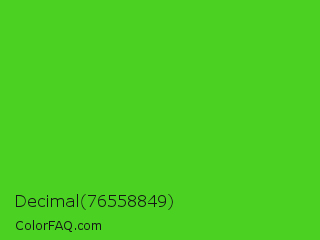 Decimal 76558849 Color is a normal green color and the nearest color is Harlequin Green #46cb18. Hex code #4ad121 and RGB value is rgb(74,209,33). In RGB color space, this color is composed of 29% red, 82% green, 13% blue, In CMYK color space, this color is composed of 65% cyan, 0% magenta, 84% yellow , 18% black , In HSL color space, this color has a hue angle of 106° , 73% saturation and 47% lightness.