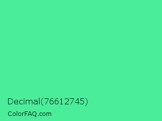 Decimal 76612745 Color is a light green color and the nearest color is Eucalyptus #44d7a8. Hex code #4aed99 and RGB value is rgb(74,237,153). In RGB color space, this color is composed of 29% red, 93% green, 60% blue, In CMYK color space, this color is composed of 69% cyan, 0% magenta, 35% yellow , 7% black , In HSL color space, this color has a hue angle of 149° , 82% saturation and 61% lightness.