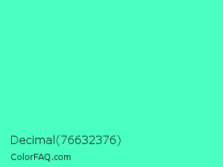 Decimal 76632376 Color is a light green color and the nearest color is Turquoise #40e0d0. Hex code #4affc2 and RGB value is rgb(74,255,194). In RGB color space, this color is composed of 29% red, 100% green, 76% blue, In CMYK color space, this color is composed of 71% cyan, 0% magenta, 24% yellow , 0% black , In HSL color space, this color has a hue angle of 160° , 100% saturation and 65% lightness.