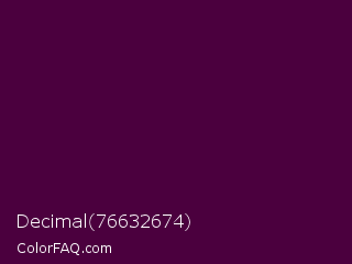 Decimal 76632674 Color is a very dark magenta color and the nearest color is Blackberry #4d0135. Hex code #4b003e and RGB value is rgb(75,0,62). In RGB color space, this color is composed of 29% red, 0% green, 24% blue, In CMYK color space, this color is composed of 0% cyan, 100% magenta, 17% yellow , 71% black , In HSL color space, this color has a hue angle of 310° , 100% saturation and 15% lightness.