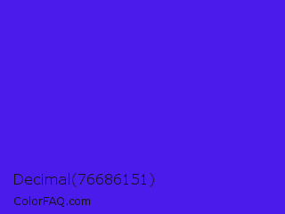 Decimal 76686151 Color is a normal indigo color and the nearest color is Han Purple #5218fa. Hex code #4b1beb and RGB value is rgb(75,27,235). In RGB color space, this color is composed of 29% red, 11% green, 92% blue, In CMYK color space, this color is composed of 68% cyan, 89% magenta, 0% yellow , 8% black , In HSL color space, this color has a hue angle of 254° , 84% saturation and 51% lightness.