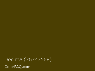 Decimal 76747568 Color is a very dark yellow color and the nearest color is Bronze Olive #4e420c. Hex code #4b3f02 and RGB value is rgb(75,63,2). In RGB color space, this color is composed of 29% red, 25% green, 1% blue, In CMYK color space, this color is composed of 0% cyan, 16% magenta, 97% yellow , 71% black , In HSL color space, this color has a hue angle of 50° , 95% saturation and 15% lightness.