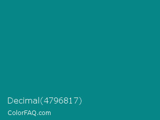 Decimal 4796817 Color is a dark cyan color and the nearest color is Dark Cyan #008b8b. Hex code #078687 and RGB value is rgb(7,134,135). In RGB color space, this color is composed of 3% red, 53% green, 53% blue, In CMYK color space, this color is composed of 95% cyan, 1% magenta, 0% yellow , 47% black , In HSL color space, this color has a hue angle of 180° , 90% saturation and 28% lightness.