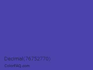 Decimal 76752770 Color is a normal indigo color and the nearest color is Ocean Blue #4f42b5. Hex code #4b44ae and RGB value is rgb(75,68,174). In RGB color space, this color is composed of 29% red, 27% green, 68% blue, In CMYK color space, this color is composed of 57% cyan, 61% magenta, 0% yellow , 32% black , In HSL color space, this color has a hue angle of 244° , 44% saturation and 47% lightness.