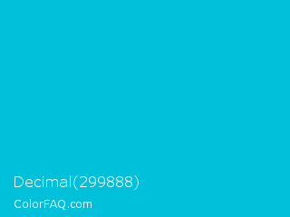 Decimal 299888 Color is a normal cyan color and the nearest color is Turquoise Surf #00c5cd. Hex code #00c0da and RGB value is rgb(0,192,218). In RGB color space, this color is composed of 0% red, 75% green, 85% blue, In CMYK color space, this color is composed of 100% cyan, 12% magenta, 0% yellow , 15% black , In HSL color space, this color has a hue angle of 187° , 100% saturation and 43% lightness.