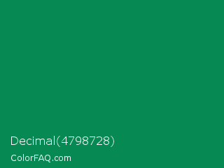 Decimal 4798728 Color is a dark green color and the nearest color is Spanish Green #009150. Hex code #078954 and RGB value is rgb(7,137,84). In RGB color space, this color is composed of 3% red, 54% green, 33% blue, In CMYK color space, this color is composed of 95% cyan, 0% magenta, 39% yellow , 46% black , In HSL color space, this color has a hue angle of 156° , 90% saturation and 28% lightness.