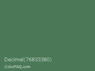 Decimal 76833380 Color is a normal green color and the nearest color is Cactus #587156. Hex code #4b7958 and RGB value is rgb(75,121,88). In RGB color space, this color is composed of 29% red, 47% green, 35% blue, In CMYK color space, this color is composed of 38% cyan, 0% magenta, 27% yellow , 53% black , In HSL color space, this color has a hue angle of 137° , 23% saturation and 38% lightness.