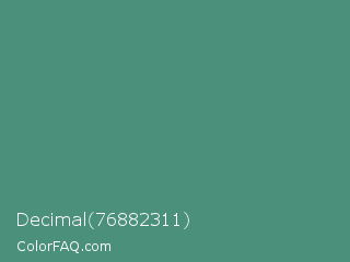 Decimal 76882311 Color is a normal green color and the nearest color is Wintergreen Dream #56887d. Hex code #4b907b and RGB value is rgb(75,144,123). In RGB color space, this color is composed of 29% red, 56% green, 48% blue, In CMYK color space, this color is composed of 48% cyan, 0% magenta, 15% yellow , 44% black , In HSL color space, this color has a hue angle of 162° , 32% saturation and 43% lightness.