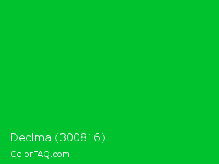Decimal 300816 Color is a normal green color and the nearest color is Vivid Malachite #00cc33. Hex code #00c22e and RGB value is rgb(0,194,46). In RGB color space, this color is composed of 0% red, 76% green, 18% blue, In CMYK color space, this color is composed of 100% cyan, 0% magenta, 76% yellow , 24% black , In HSL color space, this color has a hue angle of 134° , 100% saturation and 38% lightness.