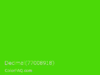 Decimal 77008918 Color is a normal green color and the nearest color is Harlequin Green #46cb18. Hex code #4bda08 and RGB value is rgb(75,218,8). In RGB color space, this color is composed of 29% red, 85% green, 3% blue, In CMYK color space, this color is composed of 66% cyan, 0% magenta, 96% yellow , 15% black , In HSL color space, this color has a hue angle of 101° , 93% saturation and 44% lightness.