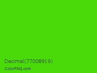 Decimal 77008919 Color is a normal green color and the nearest color is Harlequin Green #46cb18. Hex code #4bda09 and RGB value is rgb(75,218,9). In RGB color space, this color is composed of 29% red, 85% green, 4% blue, In CMYK color space, this color is composed of 66% cyan, 0% magenta, 96% yellow , 15% black , In HSL color space, this color has a hue angle of 101° , 92% saturation and 45% lightness.