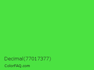 Decimal 77017377 Color is a normal green color and the nearest color is Lime Green #32cd32. Hex code #4be241 and RGB value is rgb(75,226,65). In RGB color space, this color is composed of 29% red, 89% green, 25% blue, In CMYK color space, this color is composed of 67% cyan, 0% magenta, 71% yellow , 11% black , In HSL color space, this color has a hue angle of 116° , 74% saturation and 57% lightness.