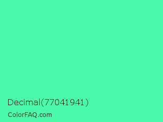 Decimal 77041941 Color is a light green color and the nearest color is Eucalyptus #44d7a8. Hex code #4bf9ab and RGB value is rgb(75,249,171). In RGB color space, this color is composed of 29% red, 98% green, 67% blue, In CMYK color space, this color is composed of 70% cyan, 0% magenta, 31% yellow , 2% black , In HSL color space, this color has a hue angle of 153° , 94% saturation and 64% lightness.