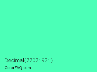 Decimal 77071971 Color is a light green color and the nearest color is Turquoise #40e0d0. Hex code #4bffb7 and RGB value is rgb(75,255,183). In RGB color space, this color is composed of 29% red, 100% green, 72% blue, In CMYK color space, this color is composed of 71% cyan, 0% magenta, 28% yellow , 0% black , In HSL color space, this color has a hue angle of 156° , 100% saturation and 65% lightness.