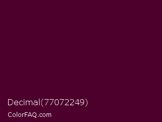 Decimal 77072249 Color is a very dark magenta color and the nearest color is Barossa #44012d. Hex code #4c002b and RGB value is rgb(76,0,43). In RGB color space, this color is composed of 30% red, 0% green, 17% blue, In CMYK color space, this color is composed of 0% cyan, 100% magenta, 43% yellow , 70% black , In HSL color space, this color has a hue angle of 326° , 100% saturation and 15% lightness.