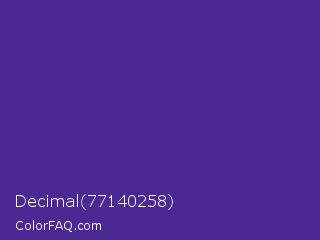 Decimal 77140258 Color is a normal indigo color and the nearest color is Daisy Bush #4f2398. Hex code #4c2892 and RGB value is rgb(76,40,146). In RGB color space, this color is composed of 30% red, 16% green, 57% blue, In CMYK color space, this color is composed of 48% cyan, 73% magenta, 0% yellow , 43% black , In HSL color space, this color has a hue angle of 260° , 57% saturation and 36% lightness.