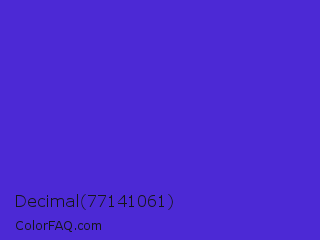 Decimal 77141061 Color is a normal indigo color and the nearest color is Purple Heart Crayola #652dc1. Hex code #4c29d5 and RGB value is rgb(76,41,213). In RGB color space, this color is composed of 30% red, 16% green, 84% blue, In CMYK color space, this color is composed of 64% cyan, 81% magenta, 0% yellow , 16% black , In HSL color space, this color has a hue angle of 252° , 68% saturation and 50% lightness.