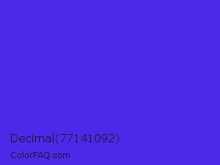 Decimal 77141092 Color is a normal indigo color and the nearest color is Han Purple #5218fa. Hex code #4c29e8 and RGB value is rgb(76,41,232). In RGB color space, this color is composed of 30% red, 16% green, 91% blue, In CMYK color space, this color is composed of 67% cyan, 82% magenta, 0% yellow , 9% black , In HSL color space, this color has a hue angle of 251° , 81% saturation and 54% lightness.
