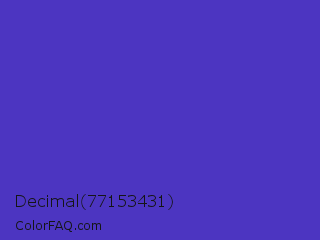 Decimal 77153431 Color is a normal indigo color and the nearest color is Ocean Blue #4f42b5. Hex code #4c35c1 and RGB value is rgb(76,53,193). In RGB color space, this color is composed of 30% red, 21% green, 76% blue, In CMYK color space, this color is composed of 61% cyan, 73% magenta, 0% yellow , 24% black , In HSL color space, this color has a hue angle of 250° , 57% saturation and 48% lightness.