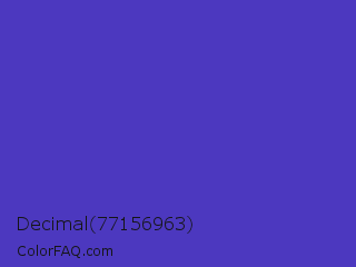 Decimal 77156963 Color is a normal indigo color and the nearest color is Ocean Blue #4f42b5. Hex code #4c38bf and RGB value is rgb(76,56,191). In RGB color space, this color is composed of 30% red, 22% green, 75% blue, In CMYK color space, this color is composed of 60% cyan, 71% magenta, 0% yellow , 25% black , In HSL color space, this color has a hue angle of 249° , 55% saturation and 48% lightness.
