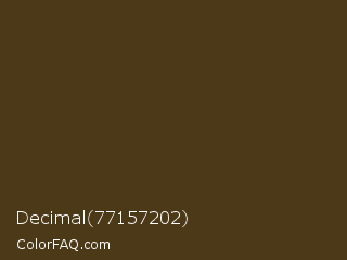 Decimal 77157202 Color is a very dark orange color and the nearest color is Metallic Bronze #49371b. Hex code #4c3918 and RGB value is rgb(76,57,24). In RGB color space, this color is composed of 30% red, 22% green, 9% blue, In CMYK color space, this color is composed of 0% cyan, 25% magenta, 68% yellow , 70% black , In HSL color space, this color has a hue angle of 38° , 52% saturation and 20% lightness.