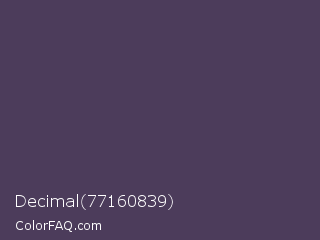 Decimal 77160839 Color is a dark purple color and the nearest color is English Violet #563c5c. Hex code #4c3c5b and RGB value is rgb(76,60,91). In RGB color space, this color is composed of 30% red, 24% green, 36% blue, In CMYK color space, this color is composed of 16% cyan, 34% magenta, 0% yellow , 64% black , In HSL color space, this color has a hue angle of 271° , 21% saturation and 30% lightness.