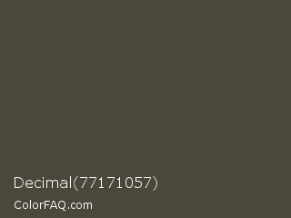Decimal 77171057 Color is a dark orange color and the nearest color is Kelp #454936. Hex code #4c473b and RGB value is rgb(76,71,59). In RGB color space, this color is composed of 30% red, 28% green, 23% blue, In CMYK color space, this color is composed of 0% cyan, 7% magenta, 22% yellow , 70% black , In HSL color space, this color has a hue angle of 42° , 13% saturation and 26% lightness.