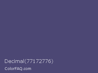 Decimal 77172776 Color is a normal indigo color and the nearest color is Independence #4c516d. Hex code #4c4774 and RGB value is rgb(76,71,116). In RGB color space, this color is composed of 30% red, 28% green, 45% blue, In CMYK color space, this color is composed of 34% cyan, 39% magenta, 0% yellow , 55% black , In HSL color space, this color has a hue angle of 247° , 24% saturation and 37% lightness.