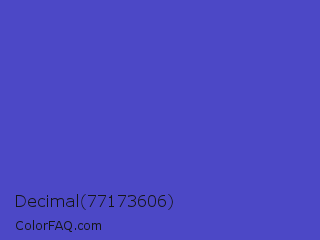 Decimal 77173606 Color is a normal indigo color and the nearest color is Iris #5a4fcf. Hex code #4c48c6 and RGB value is rgb(76,72,198). In RGB color space, this color is composed of 30% red, 28% green, 78% blue, In CMYK color space, this color is composed of 62% cyan, 64% magenta, 0% yellow , 22% black , In HSL color space, this color has a hue angle of 242° , 53% saturation and 53% lightness.