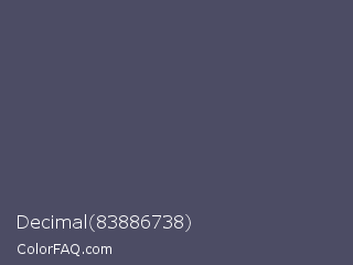 Decimal 83886738 Color is a normal blue color and the nearest color is Mulled Wine #4e4562. Hex code #4c4c64 and RGB value is rgb(76,76,100). In RGB color space, this color is composed of 30% red, 30% green, 39% blue, In CMYK color space, this color is composed of 24% cyan, 24% magenta, 0% yellow , 61% black , In HSL color space, this color has a hue angle of 240° , 14% saturation and 35% lightness.