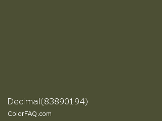 Decimal 83890194 Color is a dark yellow color and the nearest color is Rifle Green #444c38. Hex code #4c4f34 and RGB value is rgb(76,79,52). In RGB color space, this color is composed of 30% red, 31% green, 20% blue, In CMYK color space, this color is composed of 4% cyan, 0% magenta, 34% yellow , 69% black , In HSL color space, this color has a hue angle of 67° , 21% saturation and 26% lightness.