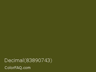 Decimal 83890743 Color is a very dark yellow color and the nearest color is Army Green #4b5320. Hex code #4c5015 and RGB value is rgb(76,80,21). In RGB color space, this color is composed of 30% red, 31% green, 8% blue, In CMYK color space, this color is composed of 5% cyan, 0% magenta, 74% yellow , 69% black , In HSL color space, this color has a hue angle of 64° , 58% saturation and 20% lightness.