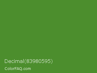 Decimal 83980595 Color is a normal green color and the nearest color is Sap Green #507d2a. Hex code #4c8e2d and RGB value is rgb(76,142,45). In RGB color space, this color is composed of 30% red, 56% green, 18% blue, In CMYK color space, this color is composed of 46% cyan, 0% magenta, 68% yellow , 44% black , In HSL color space, this color has a hue angle of 101° , 52% saturation and 37% lightness.