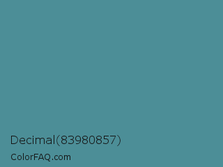 Decimal 83980857 Color is a normal cyan color and the nearest color is Wedgewood #4e7f9e. Hex code #4c8e97 and RGB value is rgb(76,142,151). In RGB color space, this color is composed of 30% red, 56% green, 59% blue, In CMYK color space, this color is composed of 50% cyan, 6% magenta, 0% yellow , 41% black , In HSL color space, this color has a hue angle of 187° , 33% saturation and 45% lightness.
