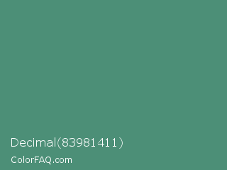 Decimal 83981411 Color is a normal green color and the nearest color is Wintergreen Dream #56887d. Hex code #4c8f77 and RGB value is rgb(76,143,119). In RGB color space, this color is composed of 30% red, 56% green, 47% blue, In CMYK color space, this color is composed of 47% cyan, 0% magenta, 17% yellow , 44% black , In HSL color space, this color has a hue angle of 159° , 31% saturation and 43% lightness.