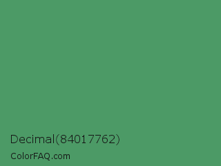 Decimal 84017762 Color is a normal green color and the nearest color is Fruit Salad #4f9d5d. Hex code #4c9a66 and RGB value is rgb(76,154,102). In RGB color space, this color is composed of 30% red, 60% green, 40% blue, In CMYK color space, this color is composed of 51% cyan, 0% magenta, 34% yellow , 40% black , In HSL color space, this color has a hue angle of 140° , 34% saturation and 45% lightness.
