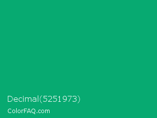 Decimal 5251973 Color is a normal green color and the nearest color is Green Munsell #00a877. Hex code #07aa71 and RGB value is rgb(7,170,113). In RGB color space, this color is composed of 3% red, 67% green, 44% blue, In CMYK color space, this color is composed of 96% cyan, 0% magenta, 34% yellow , 33% black , In HSL color space, this color has a hue angle of 159° , 92% saturation and 35% lightness.