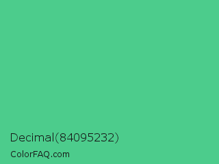 Decimal 84095232 Color is a normal green color and the nearest color is Ocean Green #48bf91. Hex code #4ccc8c and RGB value is rgb(76,204,140). In RGB color space, this color is composed of 30% red, 80% green, 55% blue, In CMYK color space, this color is composed of 63% cyan, 0% magenta, 31% yellow , 20% black , In HSL color space, this color has a hue angle of 150° , 56% saturation and 55% lightness.
