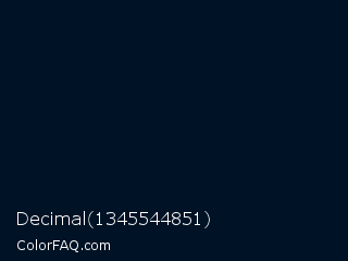 Decimal 1345544851 Color is a almost black blue color and the nearest color is Black Pearl #041322. Hex code #001225 and RGB value is rgb(0,18,37). In RGB color space, this color is composed of 0% red, 7% green, 15% blue, In CMYK color space, this color is composed of 100% cyan, 51% magenta, 0% yellow , 85% black , In HSL color space, this color has a hue angle of 211° , 100% saturation and 7% lightness.