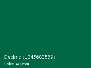 Decimal 1345683589 Color is a very dark green color and the nearest color is Bottle Green #006a4e. Hex code #006745 and RGB value is rgb(0,103,69). In RGB color space, this color is composed of 0% red, 40% green, 27% blue, In CMYK color space, this color is composed of 100% cyan, 0% magenta, 33% yellow , 60% black , In HSL color space, this color has a hue angle of 160° , 100% saturation and 20% lightness.