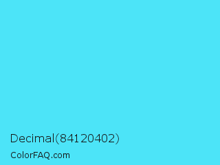 Decimal 84120402 Color is a light cyan color and the nearest color is Turquoise Blue #6cdae7. Hex code #4ce4f8 and RGB value is rgb(76,228,248). In RGB color space, this color is composed of 30% red, 89% green, 97% blue, In CMYK color space, this color is composed of 69% cyan, 8% magenta, 0% yellow , 3% black , In HSL color space, this color has a hue angle of 187° , 92% saturation and 64% lightness.
