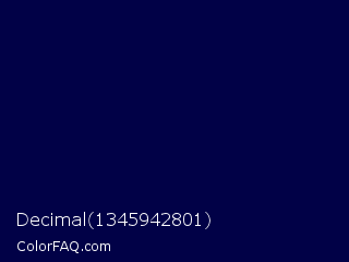Decimal 1345942801 Color is a very dark blue color and the nearest color is Stratos #000741. Hex code #010147 and RGB value is rgb(1,1,71). In RGB color space, this color is composed of 0% red, 0% green, 28% blue, In CMYK color space, this color is composed of 99% cyan, 99% magenta, 0% yellow , 72% black , In HSL color space, this color has a hue angle of 240° , 97% saturation and 14% lightness.